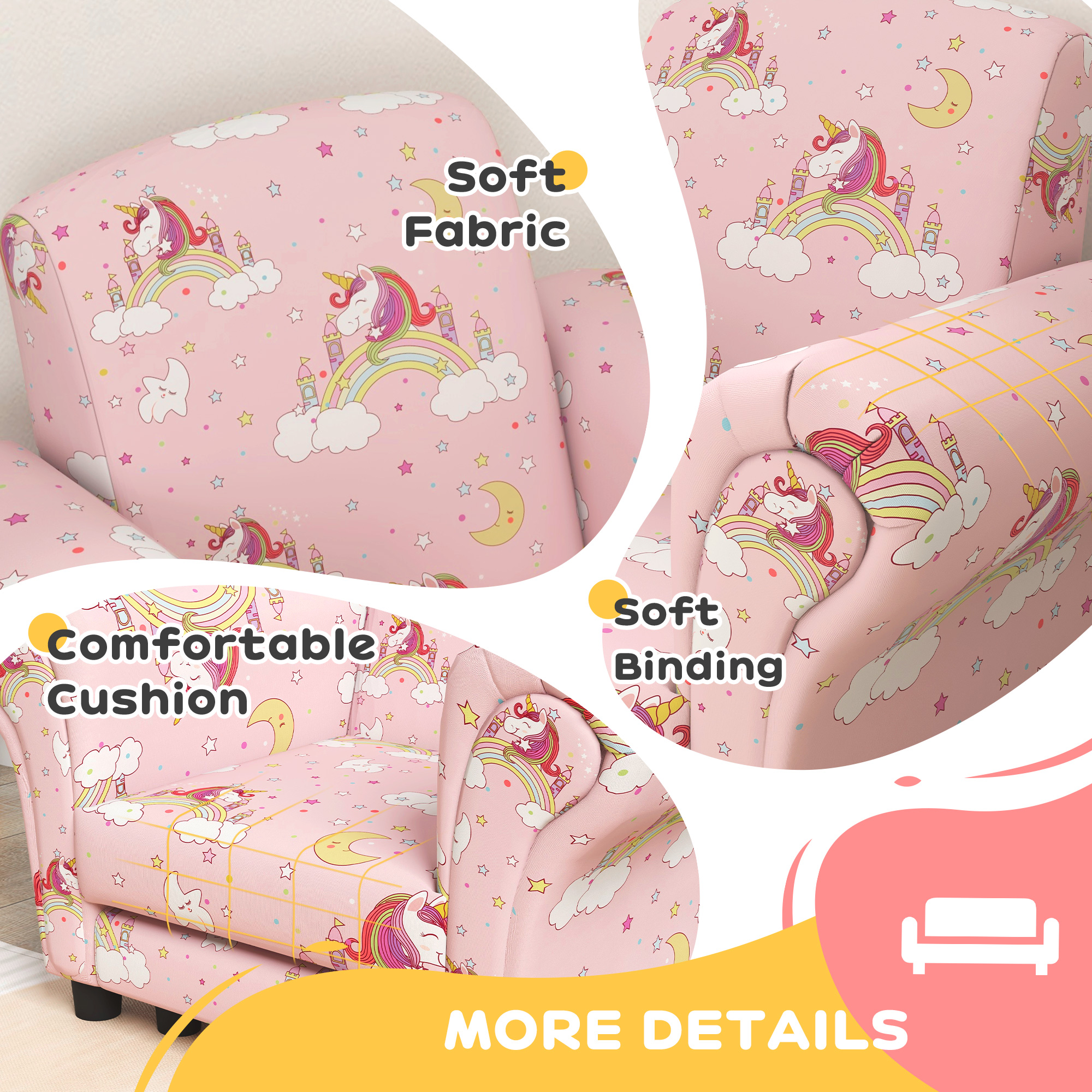 Transform your little kids space with the AIYAPLAY kids sofa set, featuring a charming unicorn print. This two-piece set includes a comfy kids armchair and a clever mini sofa stool that tucks away for easy storage. Crafted with soft fabric, padded sponge and stable wood, it's a delightful addition for any toddler's play area or bedroom. Suitable for children aged 1.5-3 years.