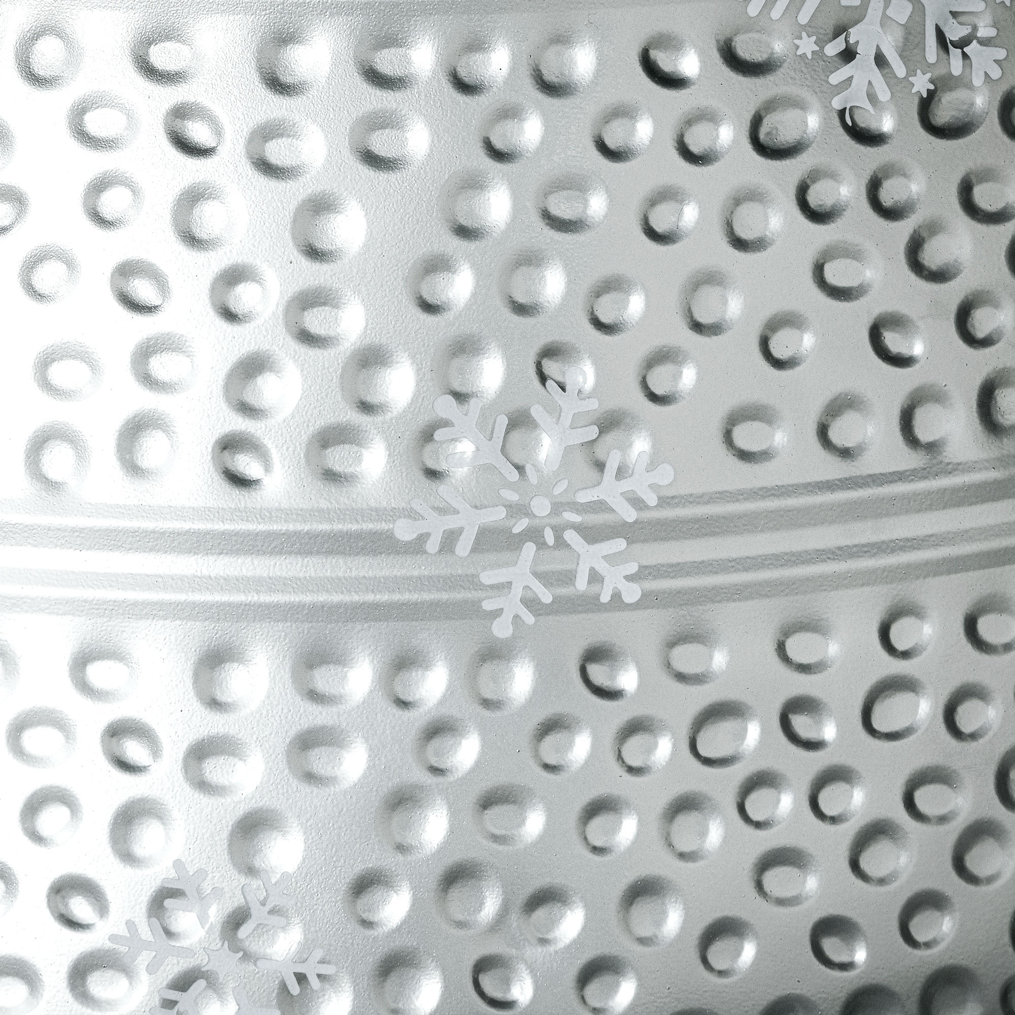 A pretty and protective finish for your Christmas tree. This steel tree collar is covered with hollow snowflakes all over. Powder coated metal makes this a strong piece to be used over again. Metal also means it will stay in shape - no need to rearrange fabric like traditional collars! It's super easy to set up too: simply fit the four pieces together and screw tight.