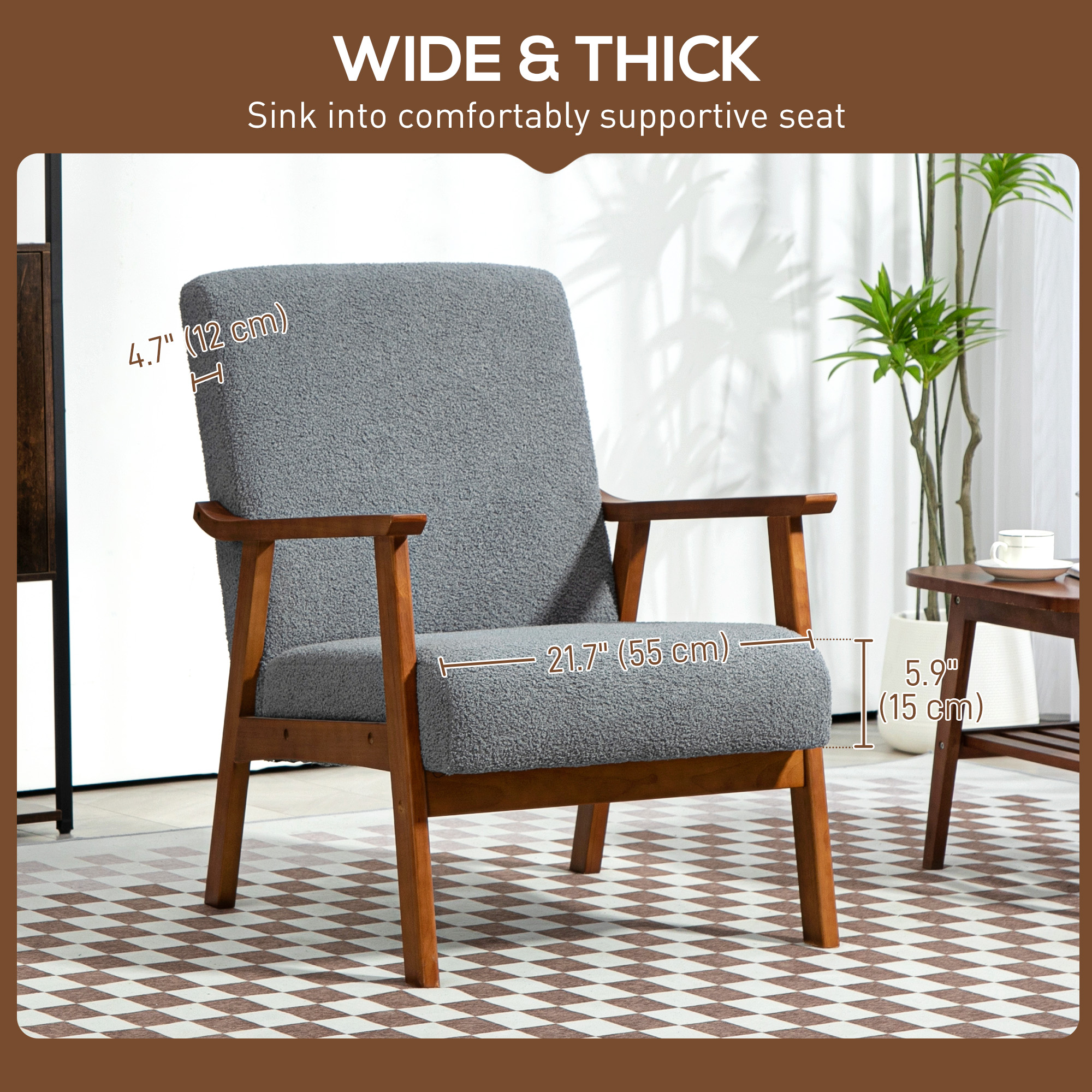 Soft and comfortable retro charm, in the form of this HOMCOM accent chair. The Mid Century design gives this comfy chair a relaxed design with the angled back and armrests, fitted with a large seat and back panel; padded with cashmere-feel boucle upholstery to sink into with ease. A wooden frame ensures this chair has a strong and supportive core. Use all throughout the home - wherever you want to bring plenty of character.