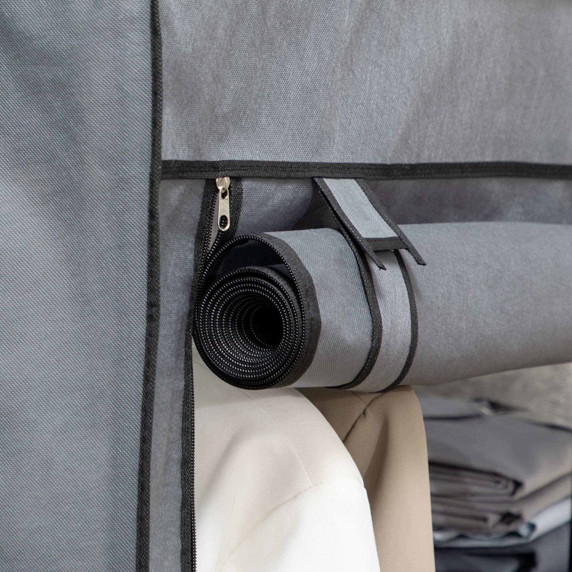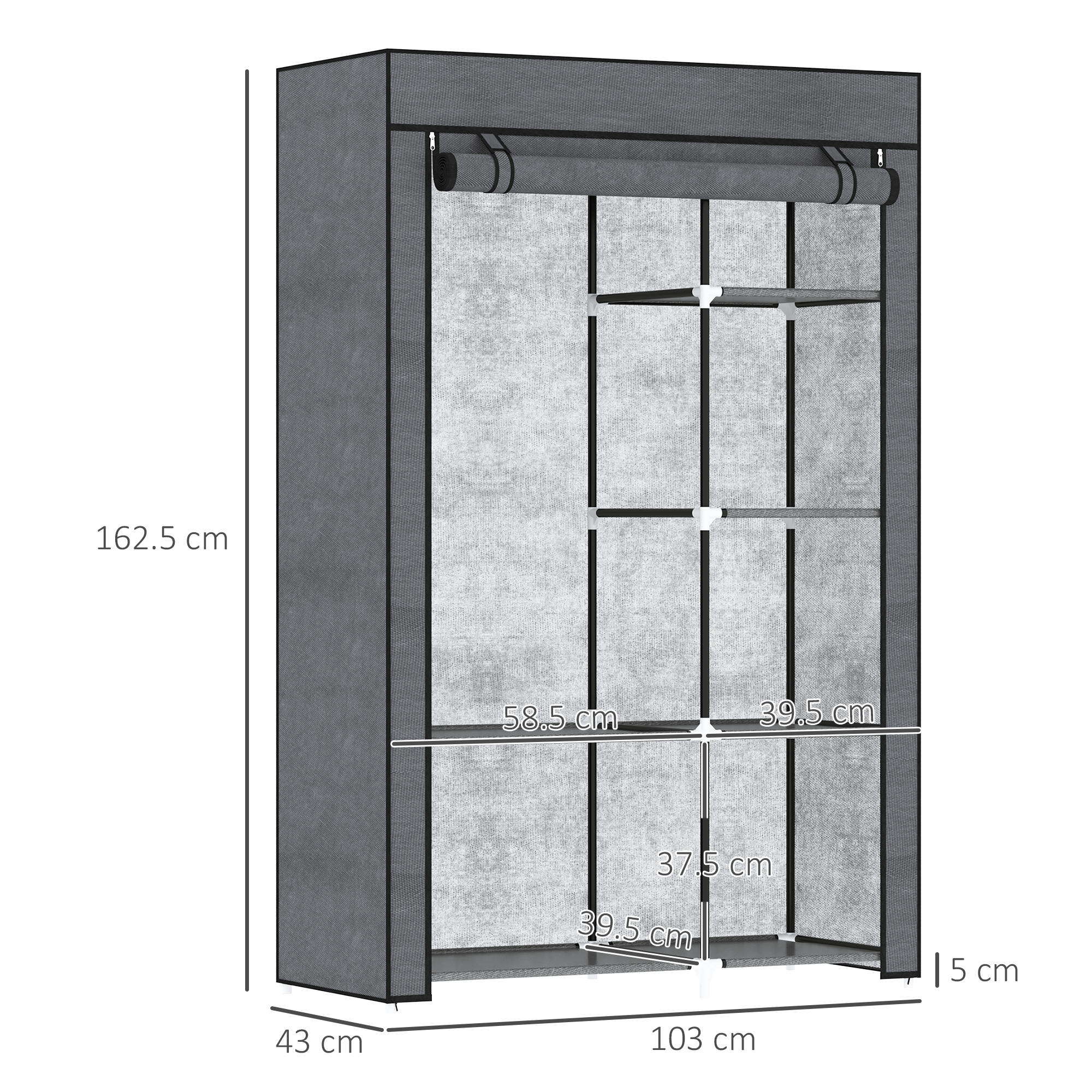 A cloth wardrobe is a great temporary - or even permanent piece for any bedroom and living space. This HOMCOM piece comes with a hanging rail for longer garments, with six shelves to hold plenty of folded pieces. A powder coated steel frame for a strong core, which supports up to 45kg. It comes with a fabric cover to offer protection when needed and a roll-up door to finish.
