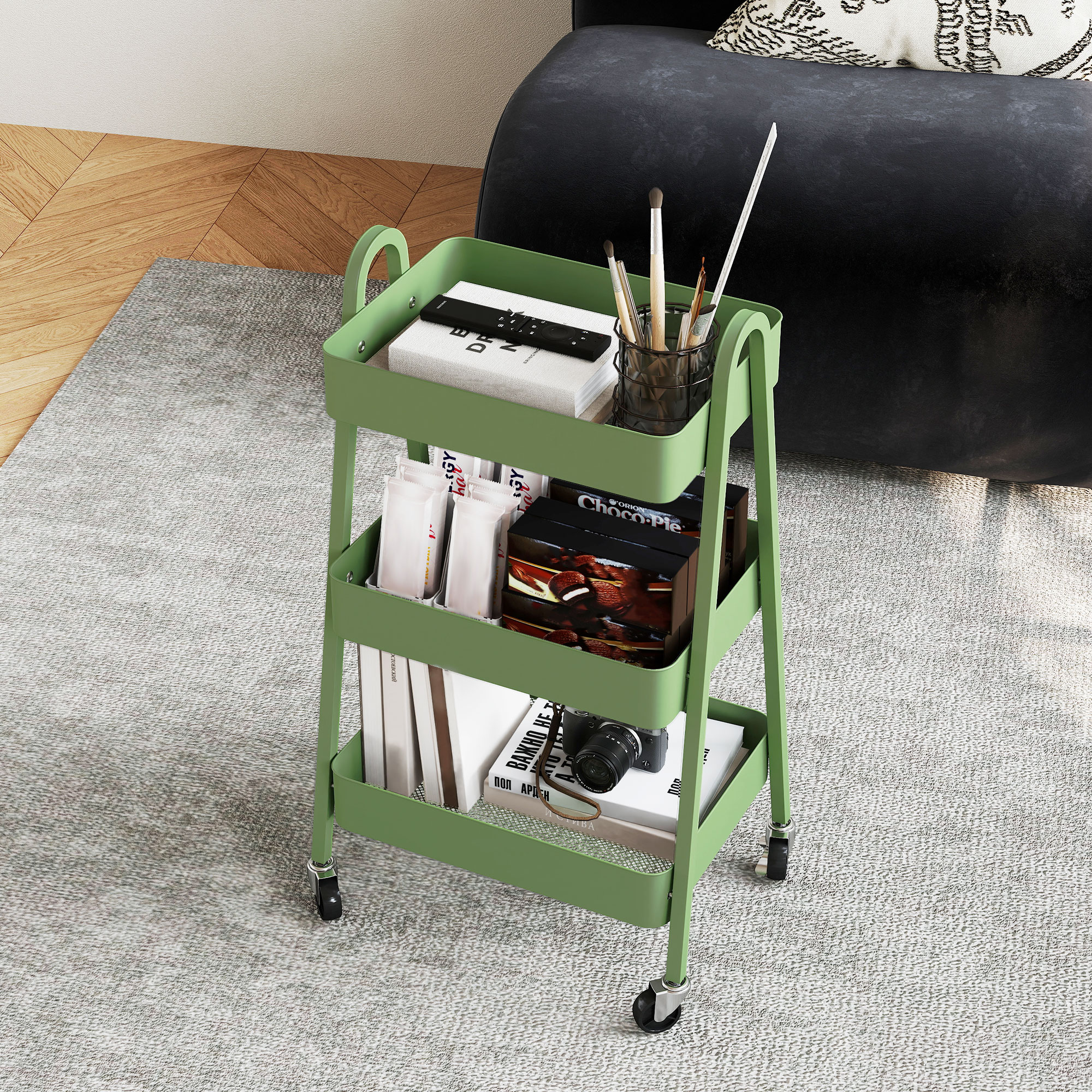 - Four wheels and top handles for smooth movement across rooms, with two brakes
