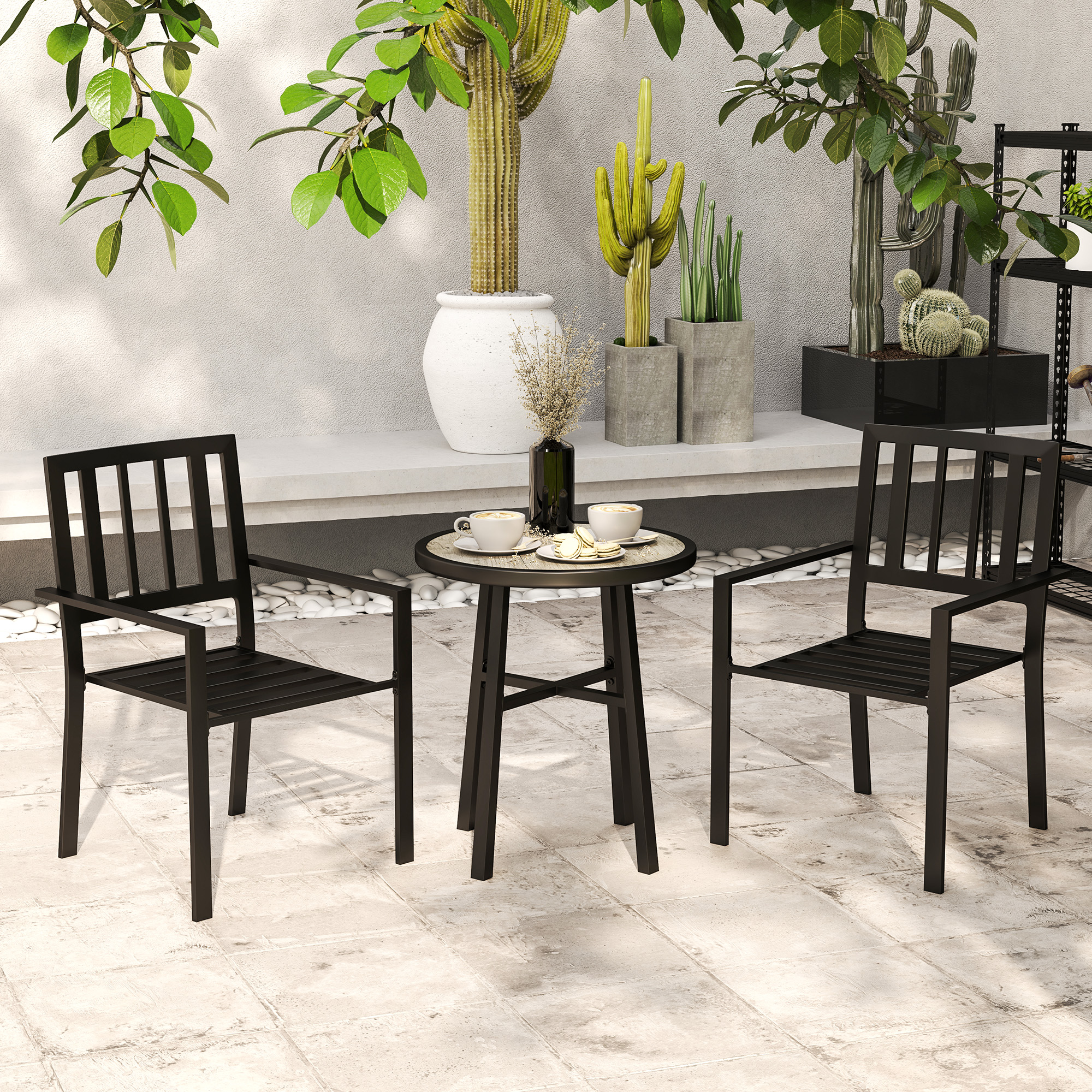 Transform your outdoor space with the Outsunny garden table and chairs, a charming ensemble that includes two metal chairs and a round table. Suitable for any patio or balcony, this balcony furniture set features stackable chairs for easy storage and a PSPC tabletop that's both wear-resistant and simple to clean, ensuring endless summer enjoyment.