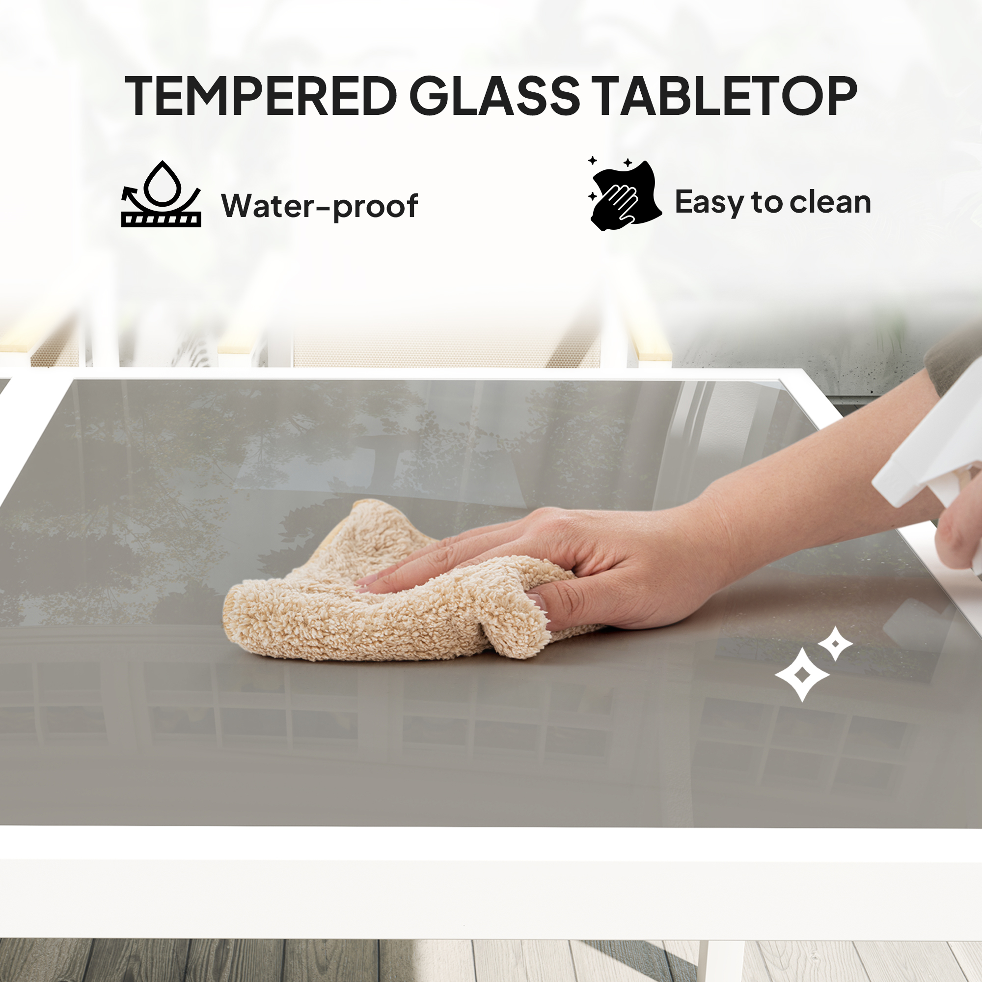 Transform your garden into a chic dining area with the Outsunny outdoor table and chairs. This elegant five-piece outdoor furniture includes four chairs and a table, the table is crafted with a sleek, tempered glass top that's a breeze to clean. High-back chairs with breathable fabric ensure cool, comfortable seating, great for enjoying sun-soaked lunches or serene evening meals.
