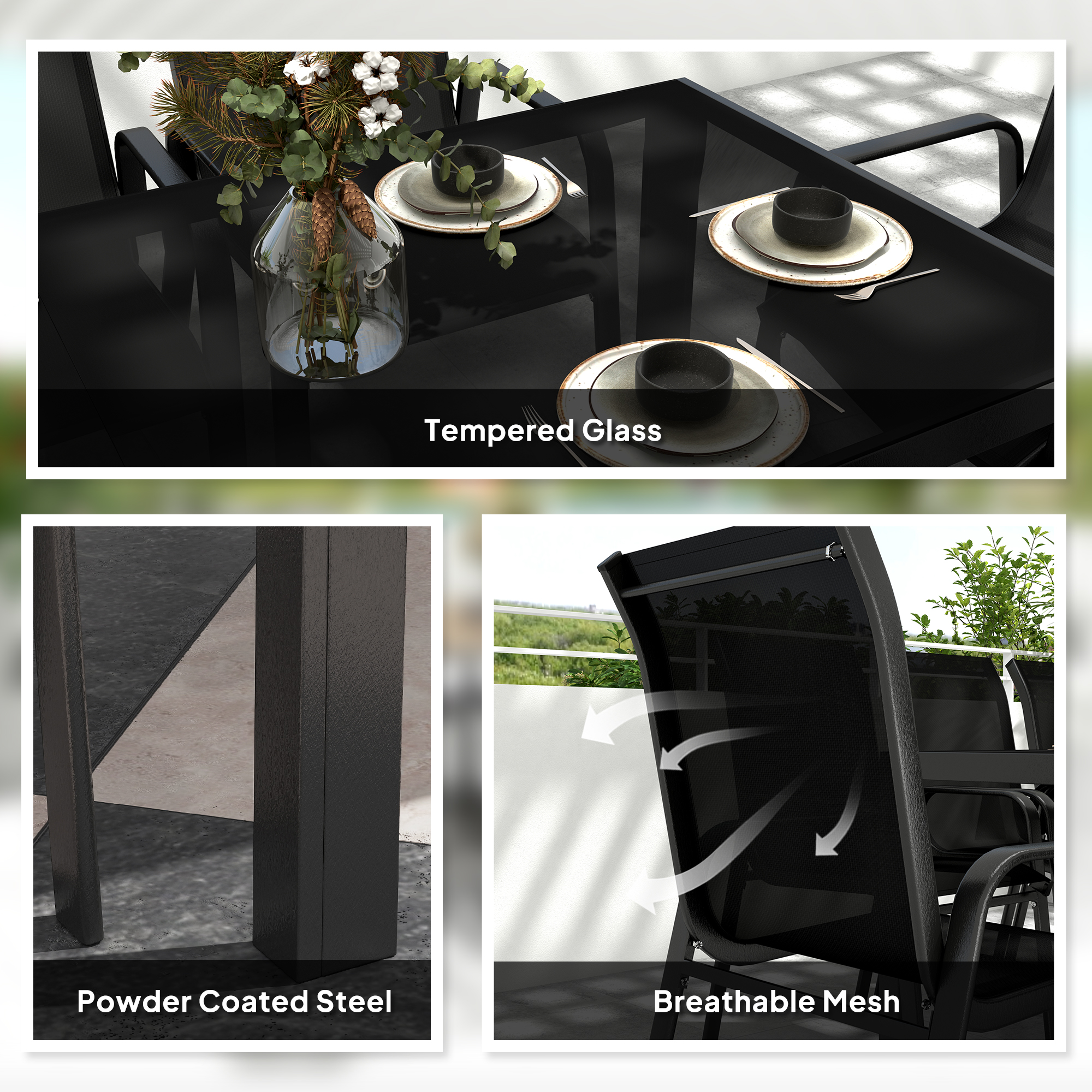Transform your garden into a stylish dining oasis with the Outsunny 8 seater garden table and chairs. Featuring breathable mesh seat and back for quick-drying comfort and chairs that stack to save space. The tempered glass top is scratch-resistant, providing a sleek, modern look while being easy to clean and maintain. It offers durability, ensuring your furniture stays looking fresh and stylish for years to come. This outdoor furniture set is great for garden parties and family gatherings!