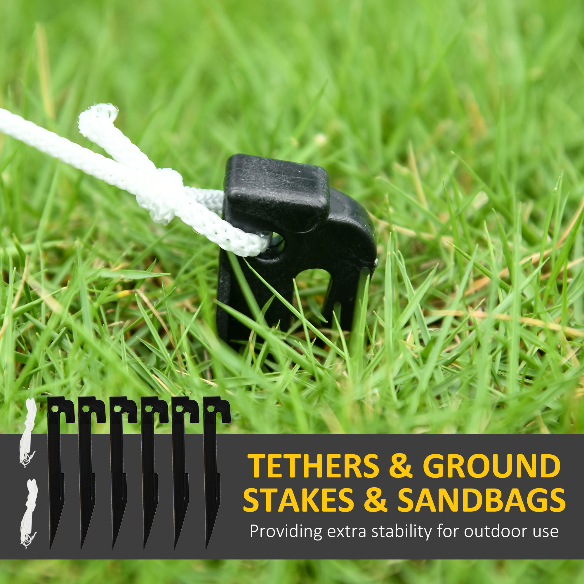 - Six ground stakes, two guy ropes and two sandbags included to pin and stabilise to the ground