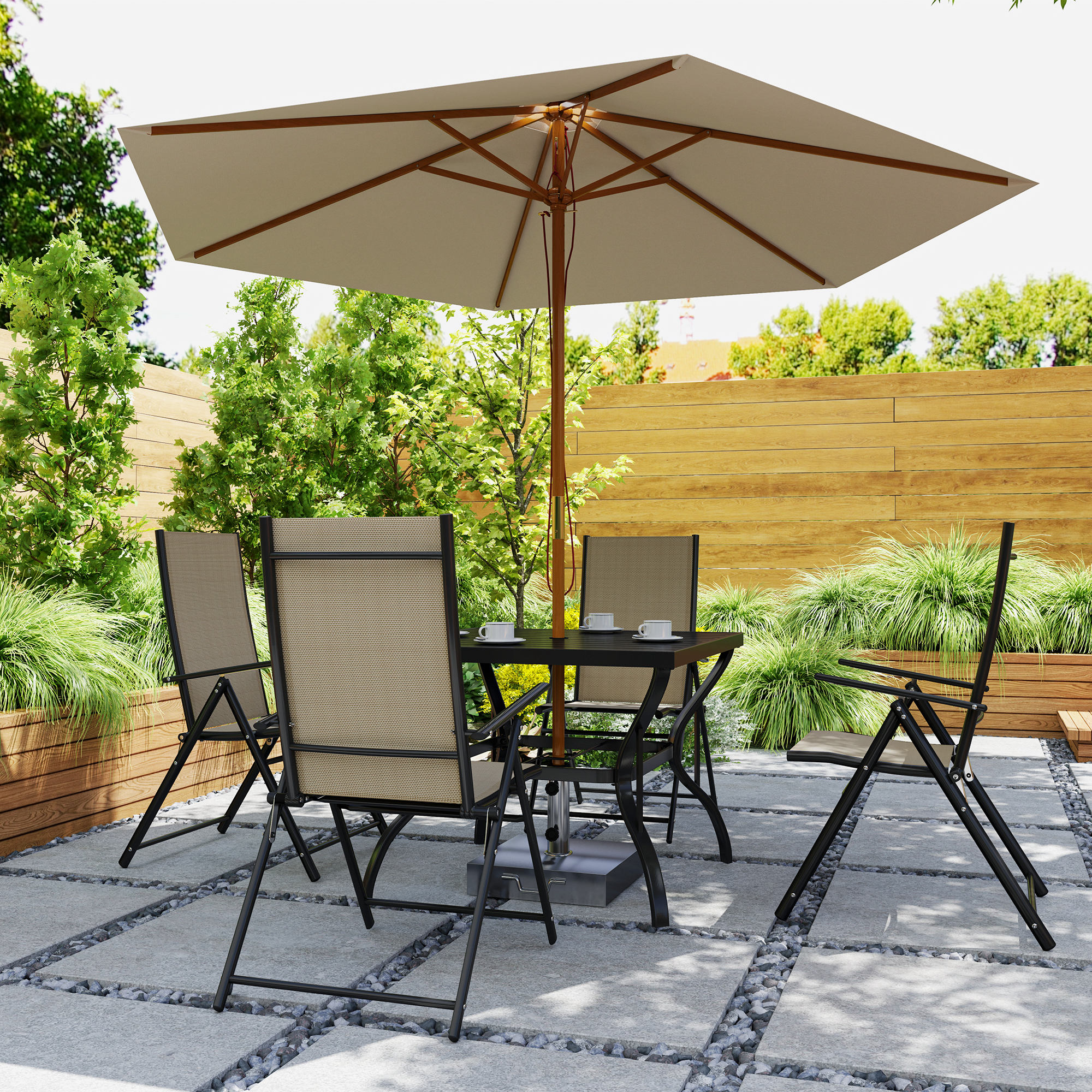 Simple, stylish outdoor dining with this Outsunny outdoor dining table and chairs set. It comes with a square dining table and four matching folding chairs: plenty of room for you and company. The powder coated galvanised steel frames mean the patio table and chairs are strong. The folding chairs save space and come with breathable texteline seats for comfort. This outdoor garden furniture set is complete with Φ50mm hole in the table to hold a parasol umbrella in place.