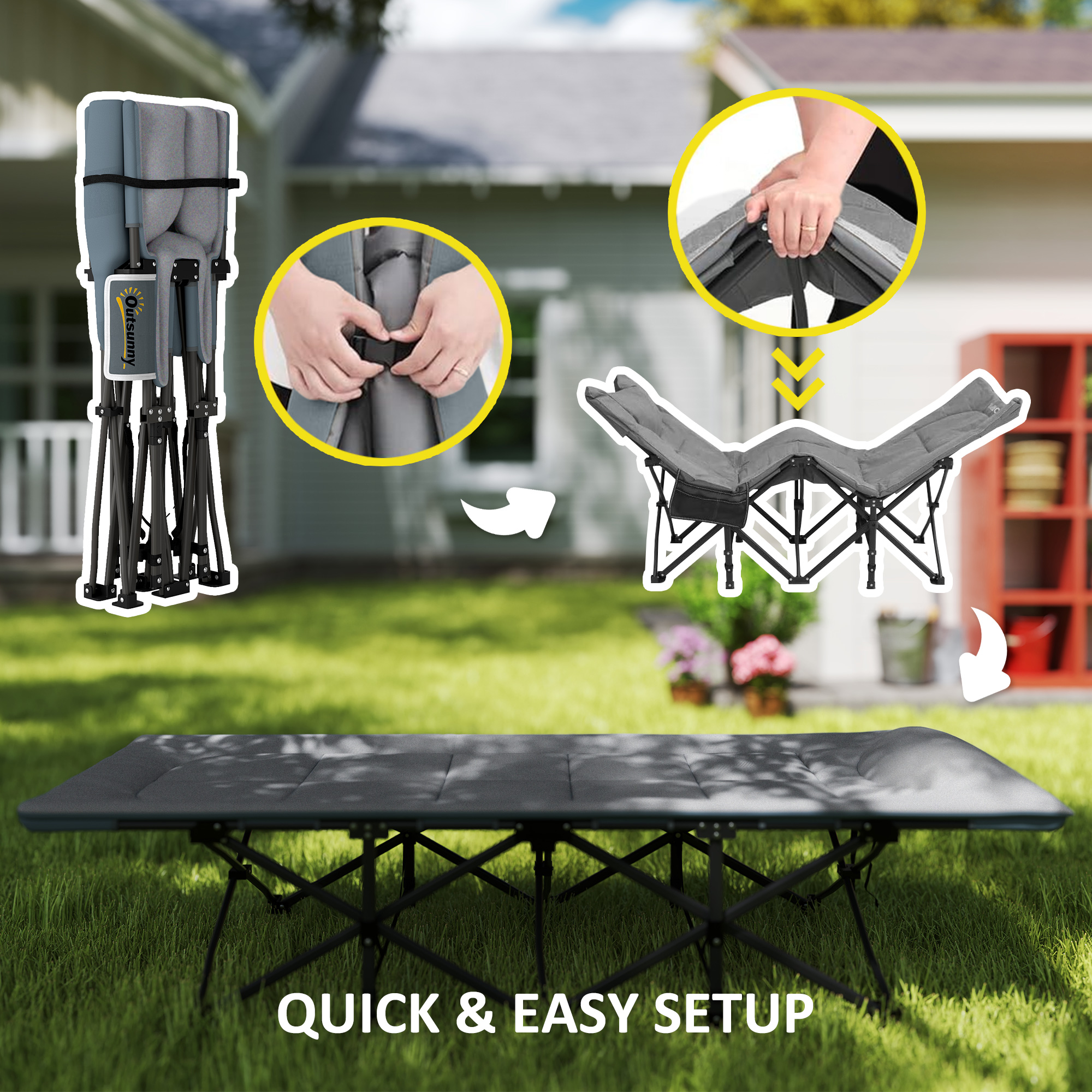 Drift into dreamland with the Outsunny Camping Cot! Boasting a cushion fused to the frame for hassle-free comfort and thicker, flat square metal tubes for enhanced stability, this folding camp bed supports up to 150 kg. Enjoy the splash-resistant, breathable fabric while keeping essentials close in the side pocket. Great for any camping enthusiast looking for a cosy night's sleep under the stars.