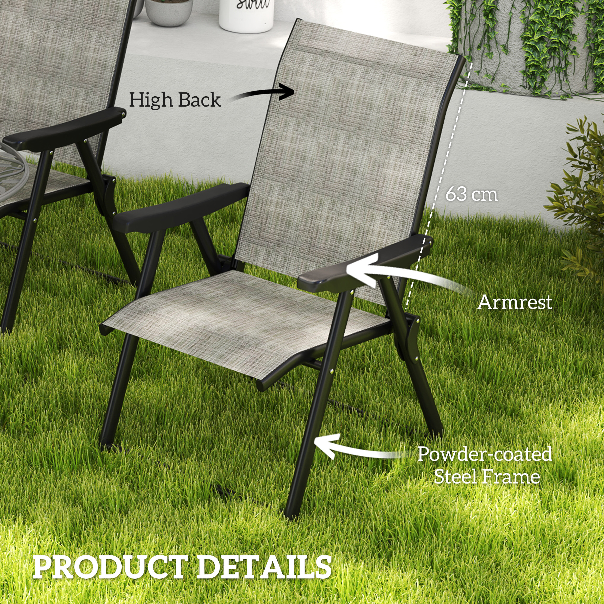 An essential set for garden and outdoor spaces - these four Outsunny outdoor chairs. With 63 cm high backs and armrests for support, the breathable mesh fabric seats hold you comfortably. Using powder coated steel frames for a strong core, these chairs are foldable - carry around and store whenever you want