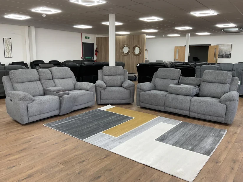 Fabric electric recliner featuring cupholders, dropdown