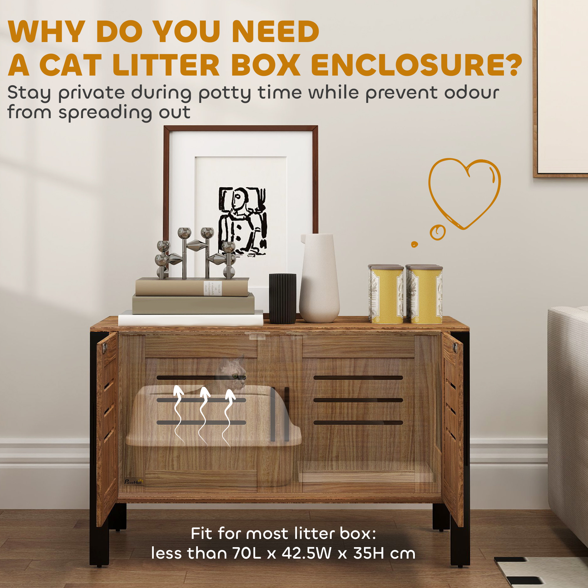 Transform your home with the PawHut Litter Box Enclosure, a sleek cat litter cupboard that doubles as a stylish table. This hidden litter box blends seamlessly into your decor while offering your feline friend a private spot. A side entrance ensures easy access and lots of ventilation keeps the area fresh. Enjoy a clutter-free space with this chic cat litter furniture!