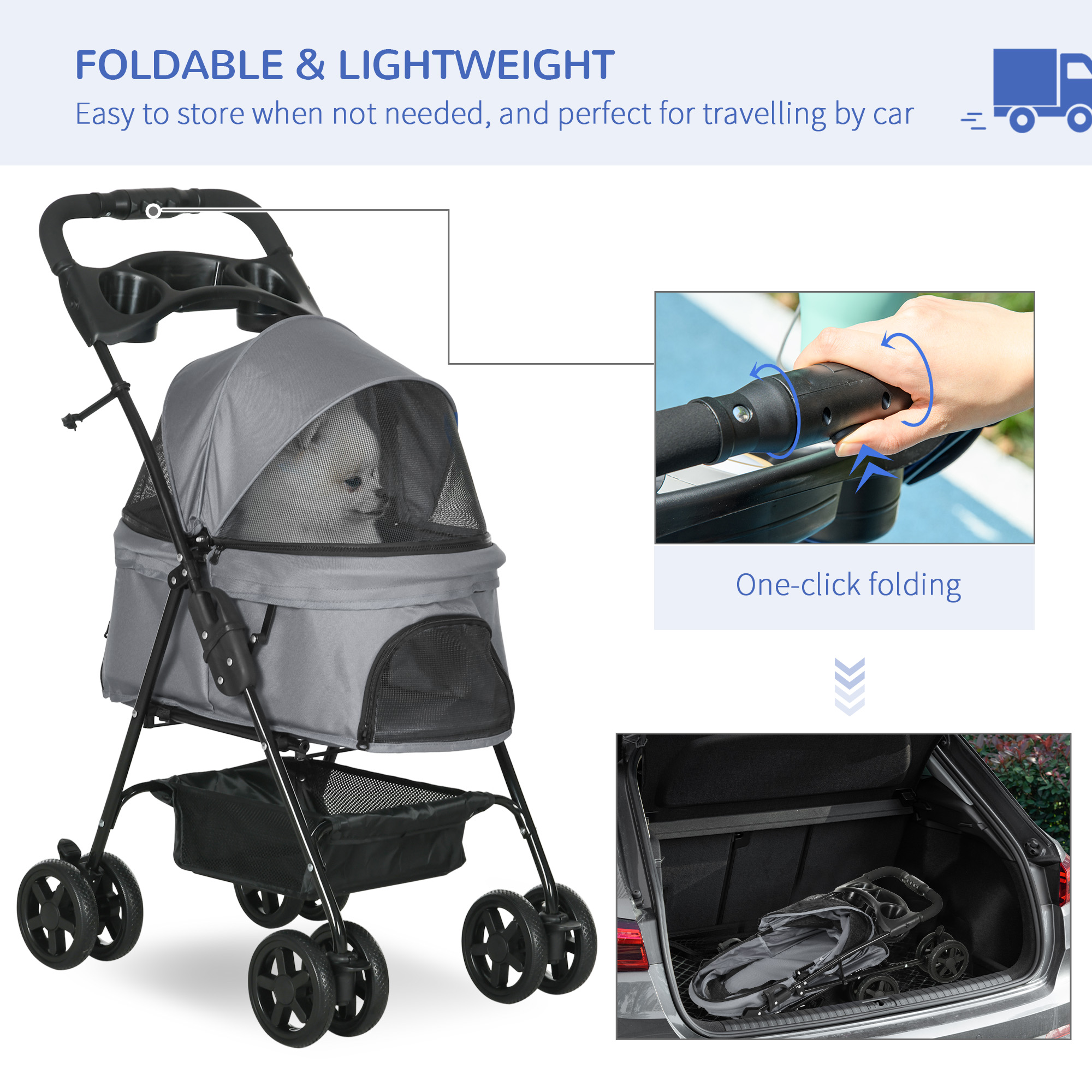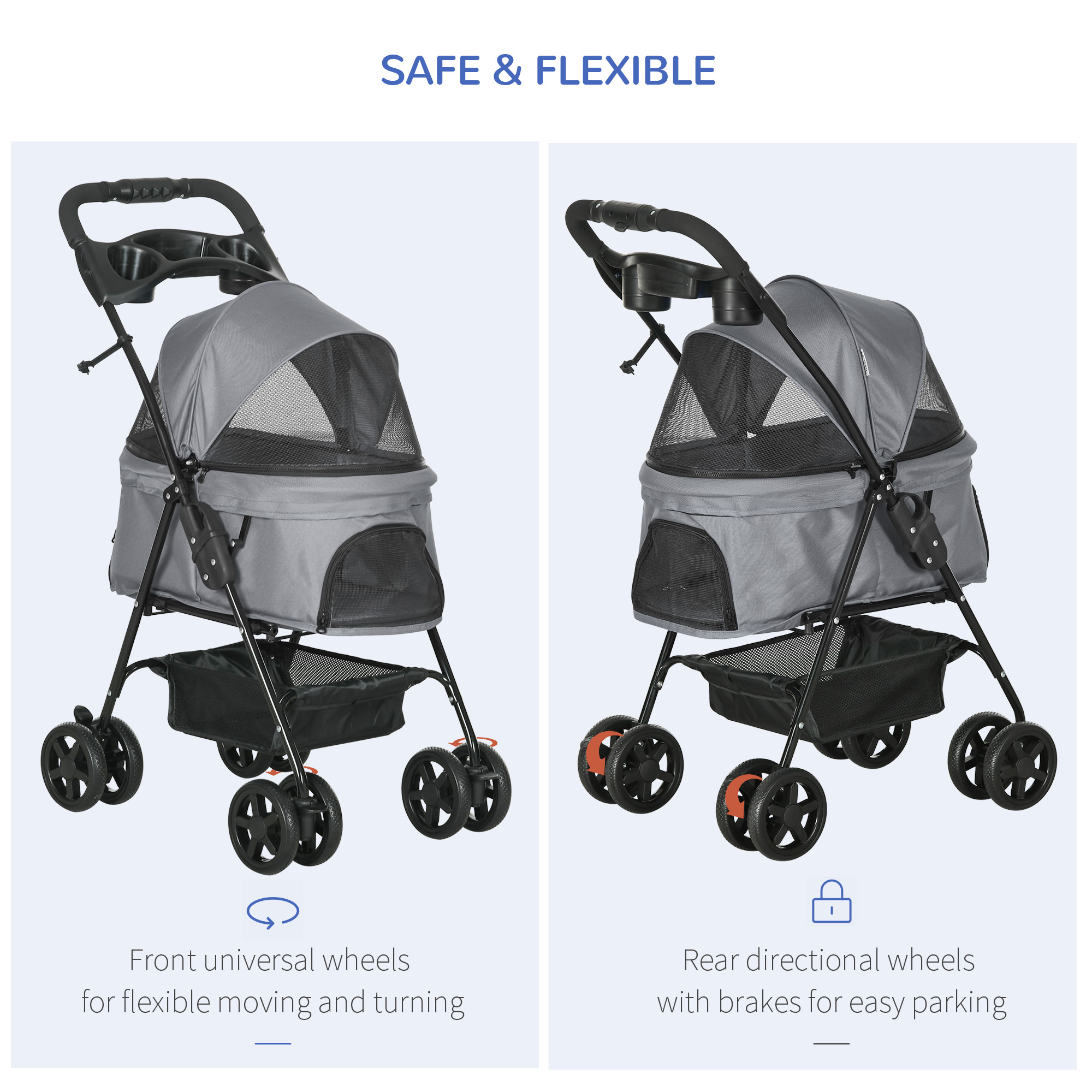 If you're looking for something easy to use, comfortable and convenient for taking injured or older pets along on the journey, look to this cat stroller from PawHut. The inner compartment is spacious and comfortable, with a mesh panel, so they can breathe. Cupholder and a basket for extra convenience, finished with four wheels to push around easily. And Lightweight rain cover can prevent cold and dampness without take off. Experience the joy of taking your pet on adventures with PawHut.