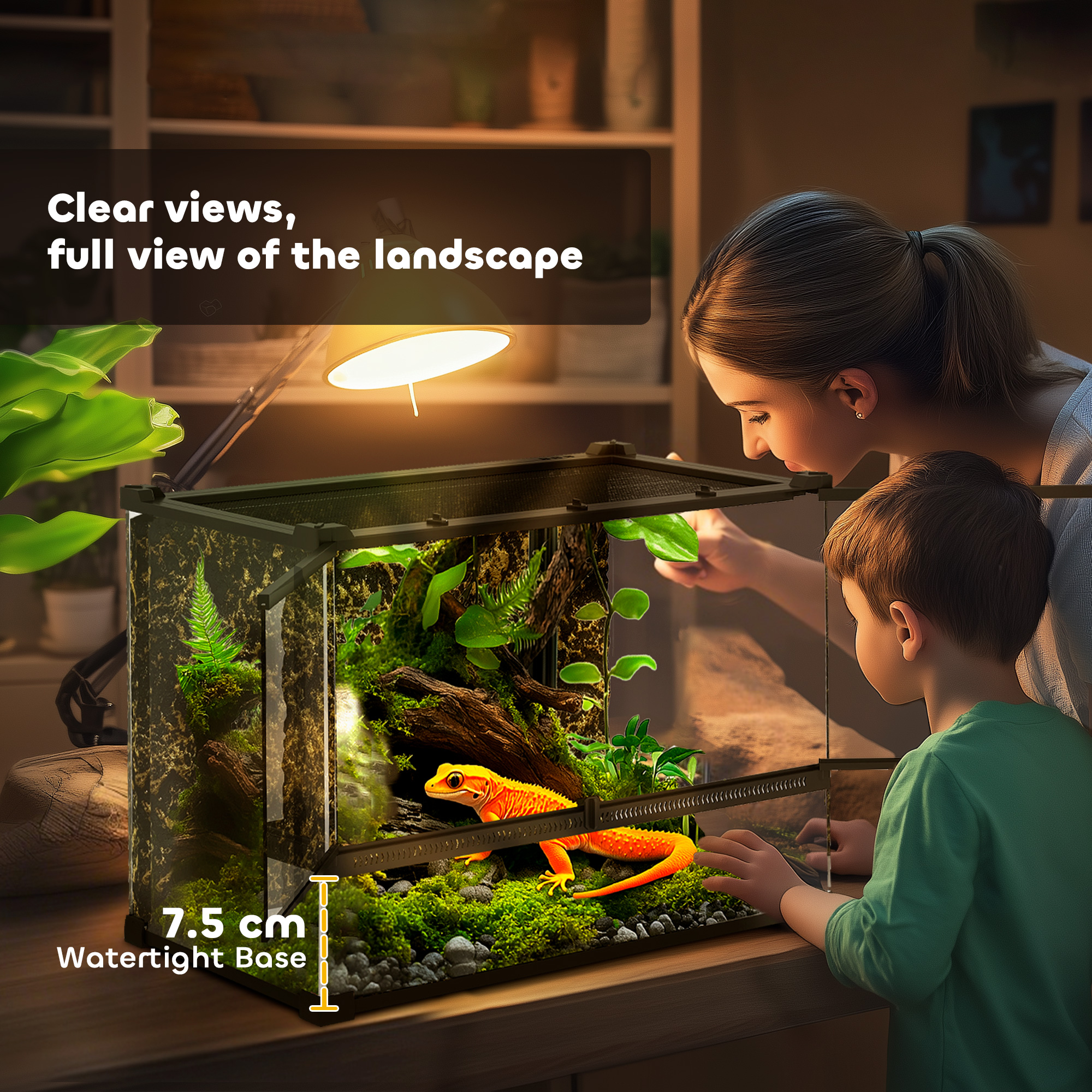 A stylish glass vivarium designed for clear viewing of your reptile's habitat. The front-opening door includes a secure knob lock to prevent escapes, while the ventilated mesh top ensures consistent airflow. Suitable for lizards, snakes, frogs, turtles, tortoises and other reptiles, it features a textured rock background that supports naturalistic landscaping, creating a space that mimics their natural surroundings.
