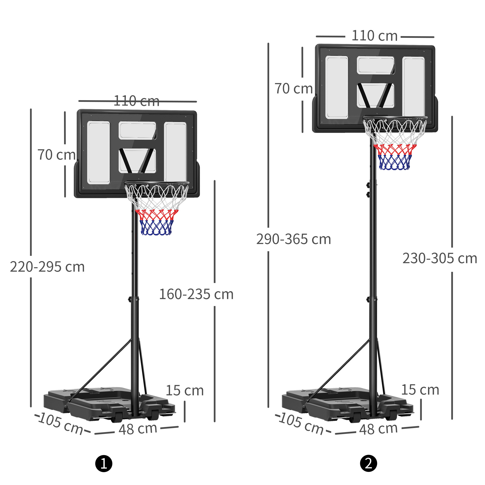 Fancy a game of basketball? Get everyone involved with this SPORTNOW portable basketball hoop! With an adjustable height of 160-305cm, it's great for all ages and heights. Just fill the base with water or sand to keep it stable and balanced. Its shatter-resistant backboard and dual-spring rim are ready for intense sessions. Plus, wheels at the bottom make for easy movement, so you can set up anywhere for thrilling games of shooting hoops!